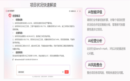 而紅圈AI的加入,則將這種可視化升級為“可解讀”、“可對話”的智能洞察。 想象一下,你不再需要費力地閱讀圖表,而是可以直接向你的“BOSS 助理Agent”提問:“小王,這個月公司現(xiàn)金流怎么樣?哪個項目成本超支最嚴重?”。這位BOSS 助理Agent能借助大模型的推理能力,精準挖掘企業(yè)自有數(shù)據(jù)模型,用自然語言向你匯報全面、準確的經(jīng)營數(shù)據(jù),甚至能主動指出異常和風險點,讓洞悉經(jīng)營狀況變得像聊天一樣簡單。更進一步。紅圈AI的“項目360°AI解讀”,能整合資金、成本、合同、付款等全維經(jīng)營指標,一鍵生成項目的全景“作戰(zhàn)圖”。 不再只是展示數(shù)據(jù),更能通過大模型深度解讀數(shù)據(jù)背后的經(jīng)營風險與應(yīng)對策略,將復雜的專業(yè)數(shù)據(jù)轉(zhuǎn)化為管理者一眼就能看懂的決策語言,真正讓管理全局盡在掌握。這能幫助解決傳統(tǒng)經(jīng)營會議中因會前準備不足、數(shù)據(jù)錯漏導致的效率低下問題。