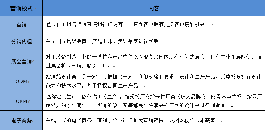 裝備制造業(yè)中由于子行業(yè)眾多,不同子行業(yè)經(jīng)營銷售模式不完全相同,營銷側(cè)重點(diǎn)也有所不同。如汽車制造中的汽車整車營銷模式側(cè)重于經(jīng)銷、專賣等模式,而諸如大型通用設(shè)備、電氣設(shè)備則側(cè)重于展會(huì)營銷、招投標(biāo)等模式;在電子設(shè)備中OEM、ODM模式則較為普遍。