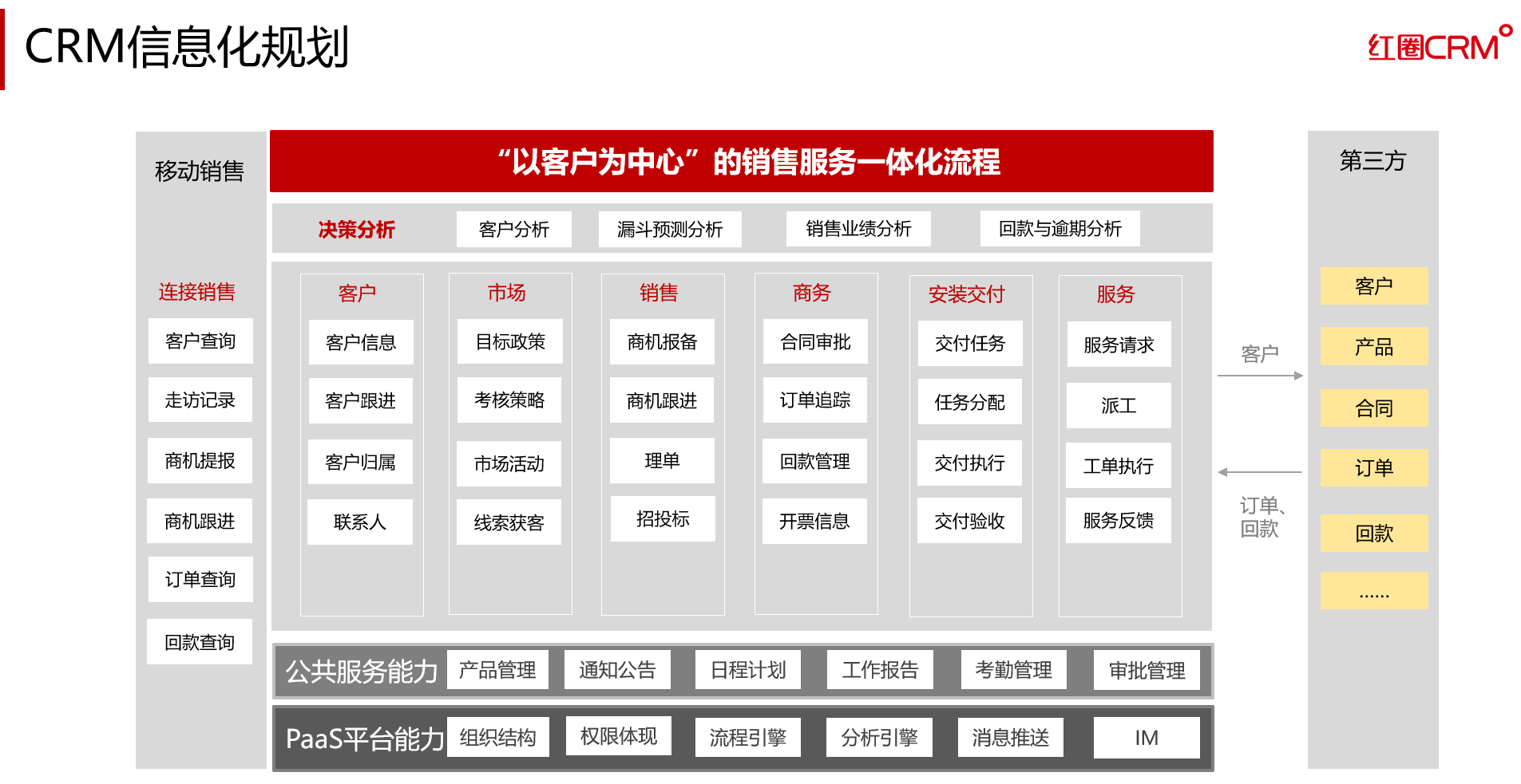 售后服務(wù)等業(yè)務(wù)環(huán)節(jié)都可能會(huì)有產(chǎn)品設(shè)計(jì)與工藝方案的調(diào)整,企業(yè)的業(yè)務(wù)模式具有明顯的多元化、個(gè)性化和碎片化特征,制造業(yè)企業(yè)必然面臨商業(yè)模式和管理模式雙重挑戰(zhàn)。為打通與改善企業(yè)從市場(chǎng)營銷、銷售、研發(fā)、采購、制造到客戶服務(wù)等核心業(yè)務(wù)環(huán)節(jié),借助紅圈CRM打造統(tǒng)一客戶交互平臺(tái),提升管理質(zhì)效,為客戶創(chuàng)造更大的價(jià)值。